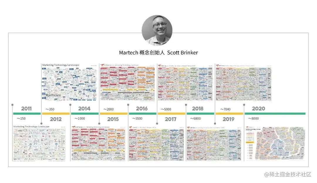 早在 2011 年,Scott Brinker 发布了首版以西方市场为主的 Martech 生态全景图(Martech Landscape),其中包括网站管理、早期的广告技术,以及搜索营销和邮件营销等技术,当时上榜的公司仅有 150 家。其后,布局图保持了几乎每年更新一次的频率,2014-2018 年全景图上的公司激增,但是近 3 年来增速明显趋缓。截至 2021 年 2 月,Scott Brinker 收录的全球 Martech 企业数量已达 8097 家,包括 8000 款产品/解决方案。可以说,Martech 的技术发展已逐步趋于稳定。