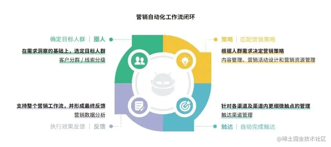 营销自动化(Marketing Automation,MA)/营销云(Marketing Cloud)是 Martech 的代表概念。这类系统其实是多个功能平台(包括 CRM)的组合,打通营销活动的各个重要环节。一个自动化的营销流程包括:产生线索-线索打分、分级-线索培育-营销策略选择-执行活动-优化用户体验-产生交易;营销自动化提供触发器、智能列表、用户圈选、过滤器等工具打通上述自动化流程,让系统执行多种营销策略,实现精细化运营。