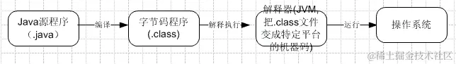 Java语言写的源程序通过Java编译器,编译成与平台无关的‘字节码程序’(.class文件,也就是0,1二进制程序),然后在OS之上的Java解释器中解释执行。