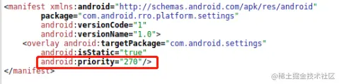 - RRO的编译结果会得到一个RROXXX_overlay.apk,加上原项目的apk,总共会有2个apk,而SRO最终只会得到一个已经完成资源替换的apk。得到的overlay.apk可以视为一个正常的apk,因为它能被安装,含有自己的AndroidManifest.xml文件,当然正常下,RROXXX_overlay.apk是不含有执行代码的。