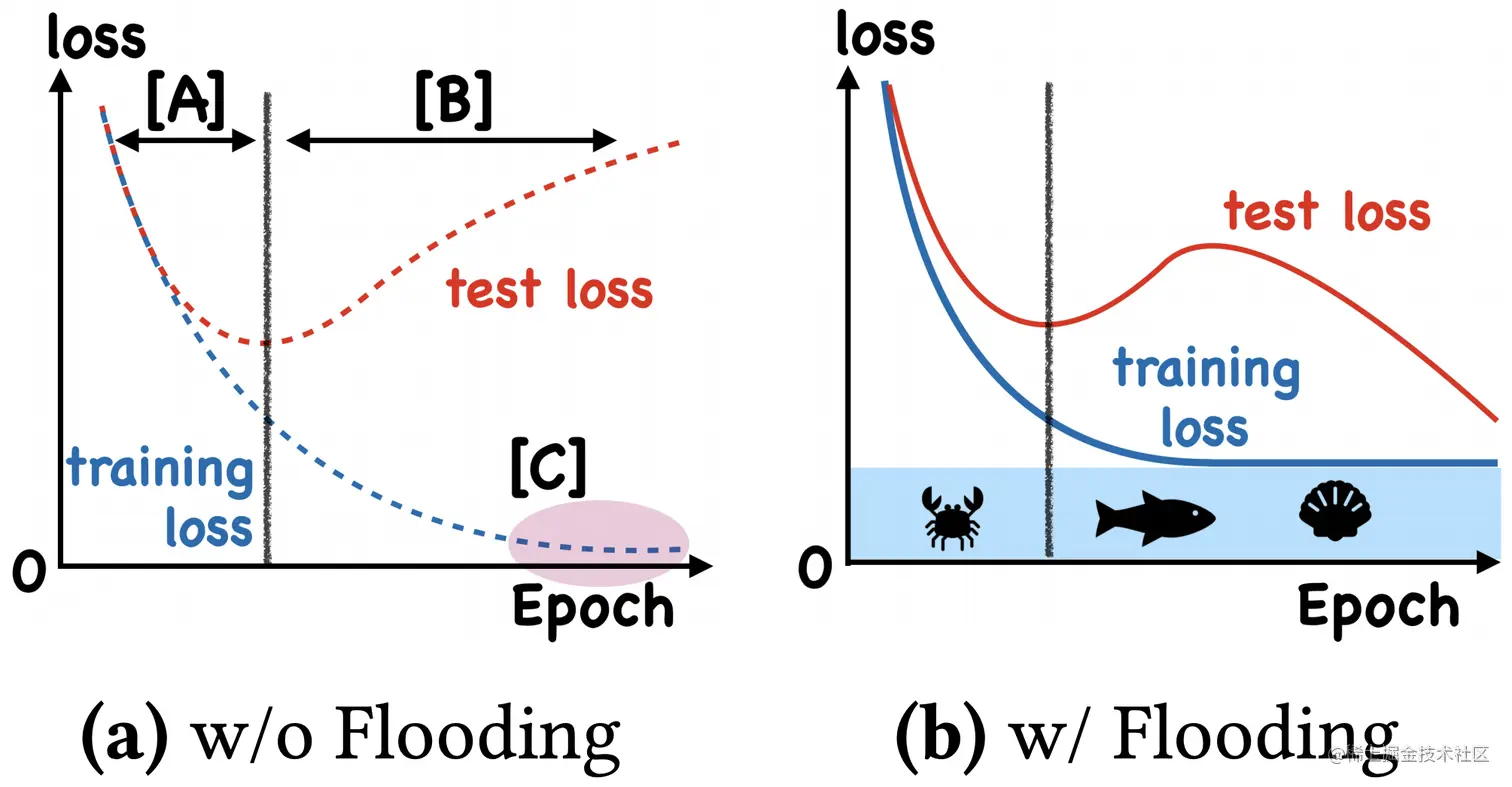 ICML2020的论文《Do We Need Zero Training Loss After Achieving Zero Training Error?》提出了一种Flooding方法,用于缓解模型过拟合,详情可以看我的文章《我们真的需要把训练集的损失降到零吗?》。这里简单过一下,论文提出了一个超参数b,并将损失函数改写为