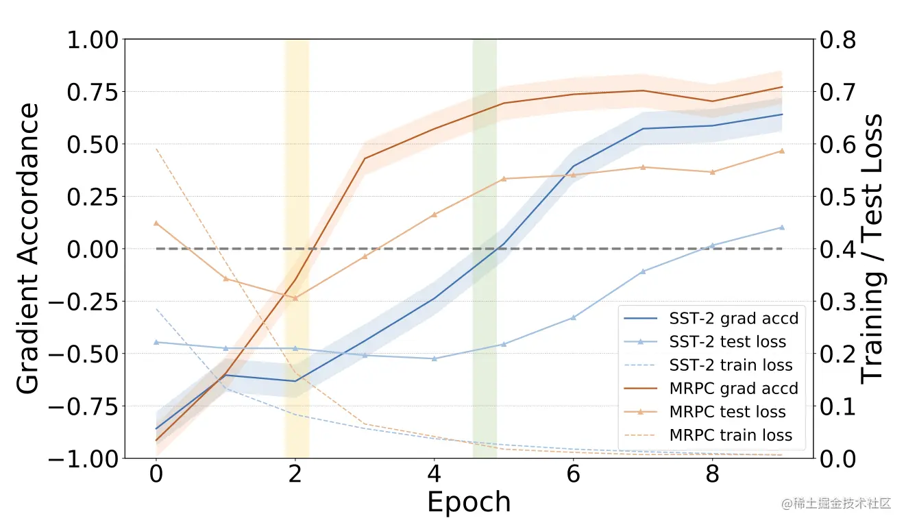 从下图可以看出,当梯度一致性指标从负数变为正数时,测试集损失也开始上升,说明梯度一致性这个指标可以很好的当作是过拟合的信号