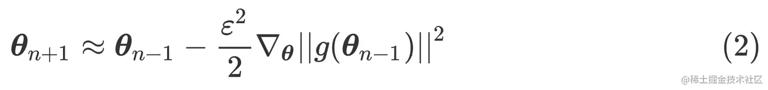 其中,θn表示第n次迭代的参数,g(θn−1)=∇θL(θn−1)表示损失对参数θn−1的梯度。式(2)的结果相当于以2ε2为学习率、损失函数为梯度惩罚∣g(θ)∣∣2=∣∣∇θL(θ)∣∣2∣ 的梯度下降