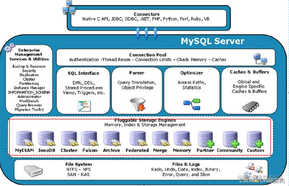 从体系结构图中可以发现,MySQL 数据库区别于其他数据库的最重要的一个 特点就是其插件式的表存储引擎。MySQL 插件式的存储引擎架构提供了一系列标 准的管理和服务支持,这些标准与存储引擎本身无关,可能是每个数据库系统本 身都必需的,如 SQL 分析器和优化器等,而存储引擎是底层物理结构和实际文件 读写的实现,每个存储引擎开发者可以按照自己的意愿来进行开发。需要特别注 意的是,存储引擎是基于表的,而不是数据库。