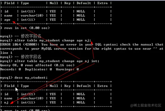 - 修改字段名:alter table 表名 change 旧字段名新字段名字段类型 [列属性] [新位置]