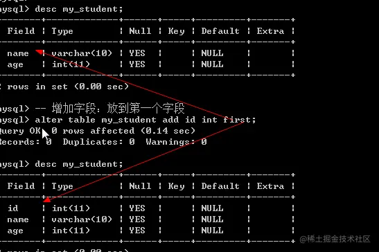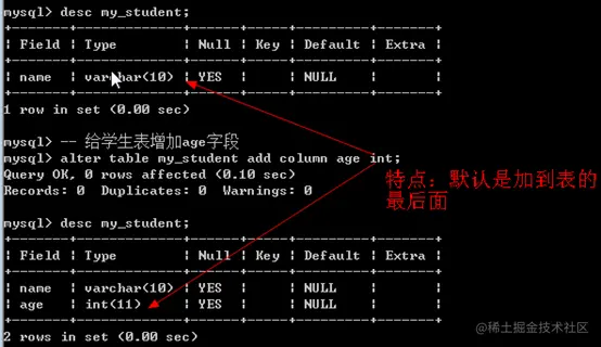 - 新增字段:alter table 表名 add [column] 新字段名列类型 [列属性] [位置first/after 字段名]
