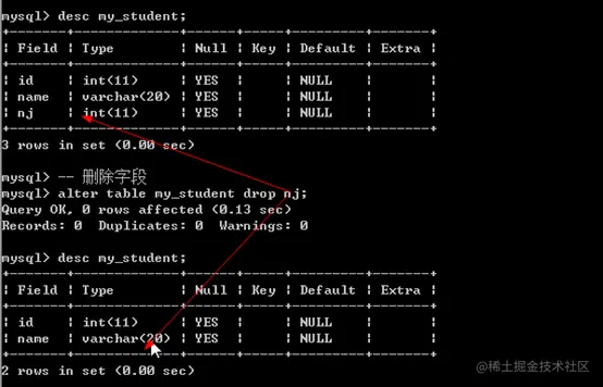 - 删除字段:alter table 表名 drop 字段名
