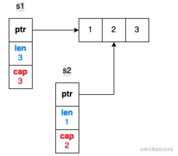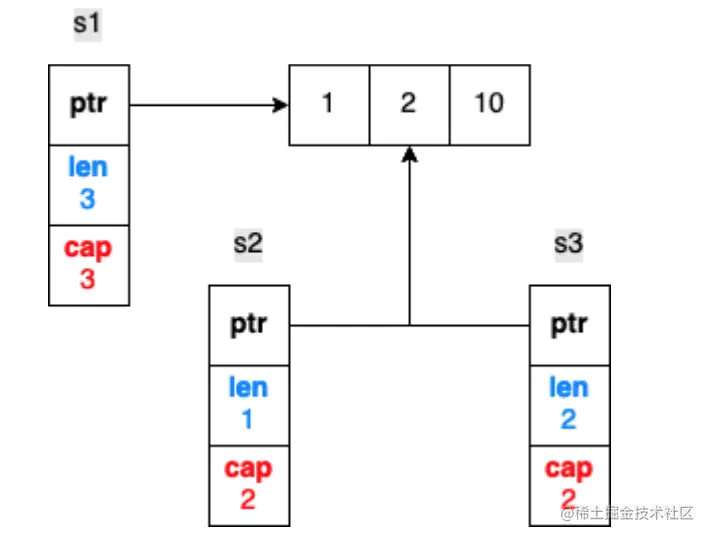 s1是长度为3,容量为3的切片结构,而s2是长度为1,容量为2的切片结构,s1和s2的都指向相同的底层数组。