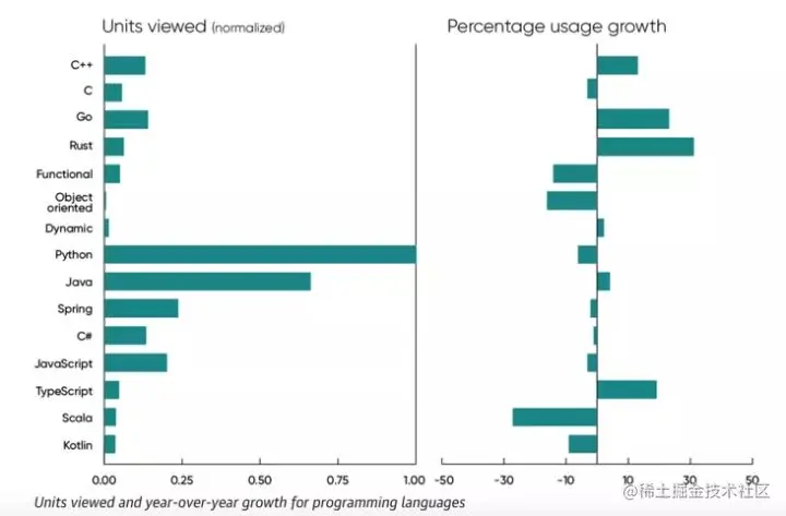 另外,Python 和 Java 依旧是该平台上的两大编程语言,不过此次数据显示今年关于 Python 和 Java 的内容使用率略有下降,而关于 Rust 和 Go 的内容使用率正在快速增长(尽管相对较小)。