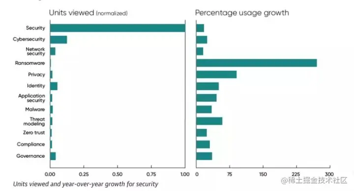因此,在该调查报告中,我们也看到关于安全领域特定主题方面的内容有了大幅增加。其中,勒索软件相关内容的使用率几乎翻了 3 倍(增长 270%)。关于隐私的内容上升了 90%;threat modeling 上升了 58%;identity 上升了 50%;应用程序安全性提高了 45%;恶意软件上升了 34%;zero trust 上升了 23%。尽管“供应链安全”尚未成为一个安全话题,但有关供应链管理的内容的使用率也已经增长了 30%。