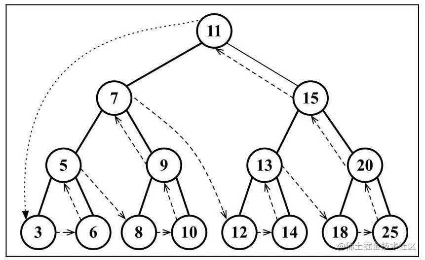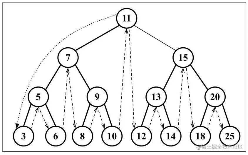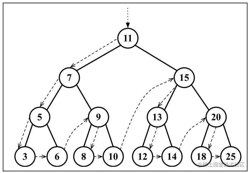 控制台的输出结果:11, 7, 5, 3, 6, 9, 8, 10, 15, 13, 12, 14, 20, 18, 25