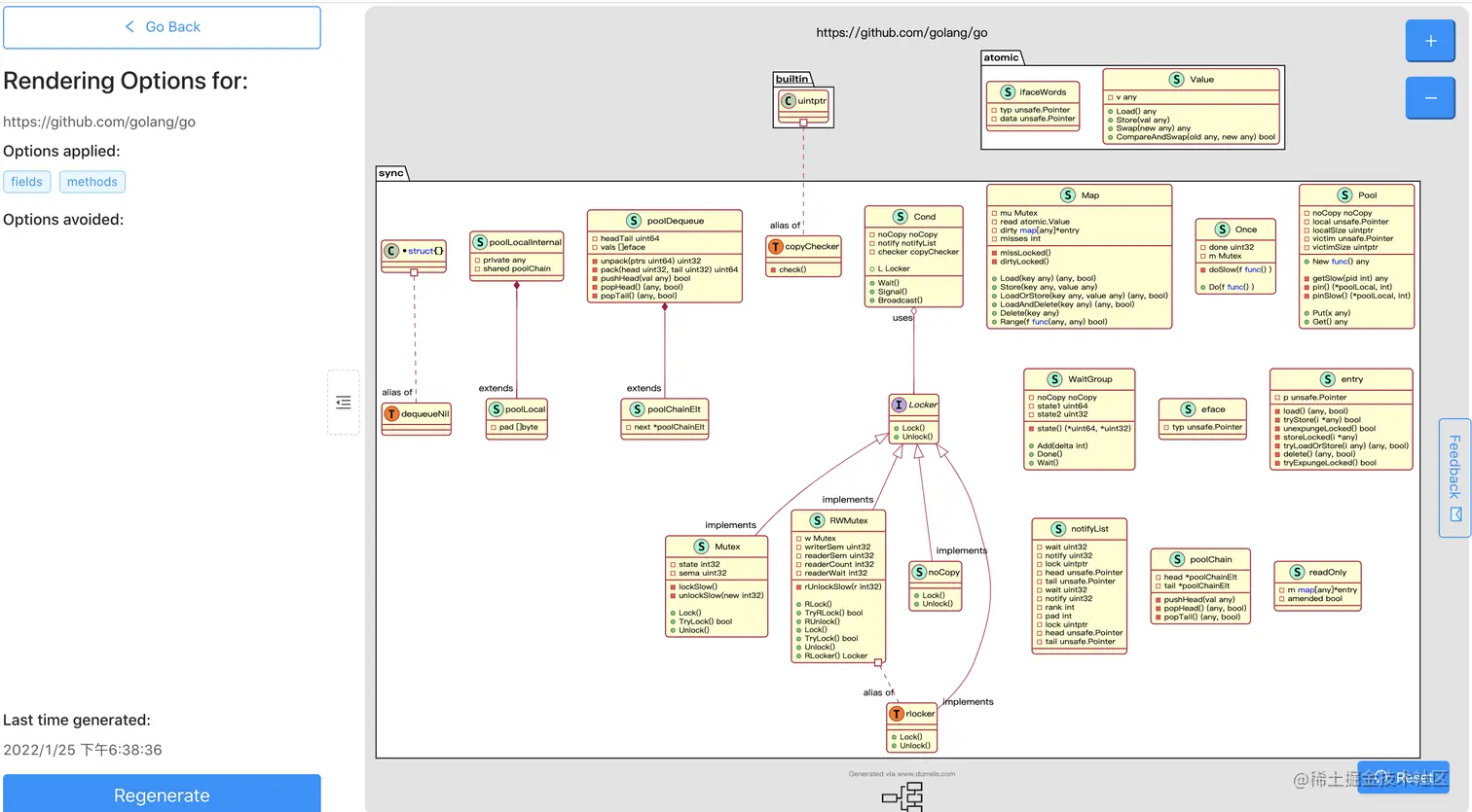 这个项目可以分析一个 Go 项目,然后生成接口和结构体的 UML 图。有了这个图之后,基本上也就对项目整体关系有了一个基本概念,再读代码的话,相对来说会容易一些。