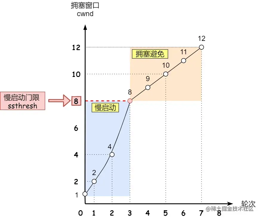 cwnd>=ssthresh时,就会使用拥塞避免算法