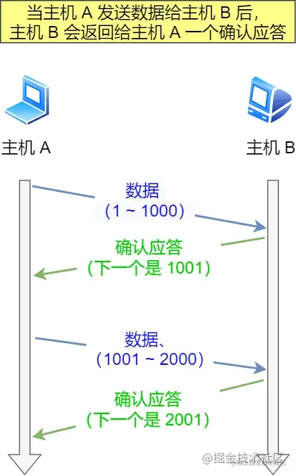 在TCP中,当发送端的数据到达接收主机时,接收端主机会返回应该确认应答消息,表示已收到消息。