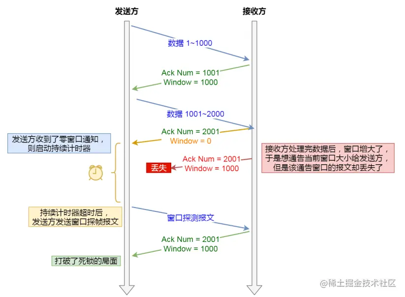 - 会向发送方通告一个窗口非0的ACK报文,如果这个报文再网络中丢失了,这会导致发送方一直等待接收方的非0窗口通知,接收方也一直等待发送方的数据,如果不采取措施,会造成死锁的现象