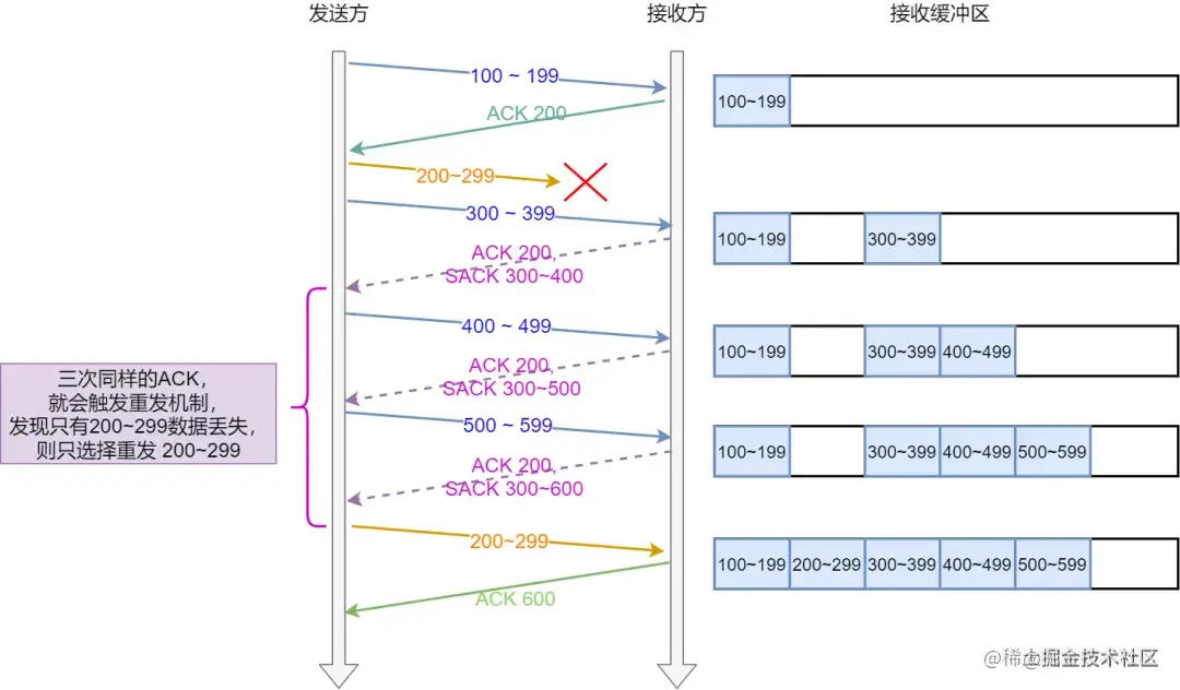 如图,发送方收到了三次同样的ACK确认报文,于是就会触发快速重传机制,通过SACK信息发现只有200-299这段数据丢失,于是只重发这一段数据。