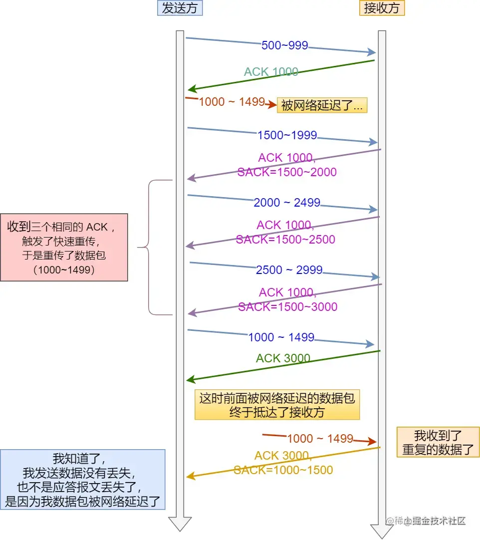 - 所以接收方回了一个SACK=1000-1500,表示这是个重复的包