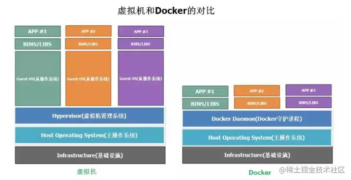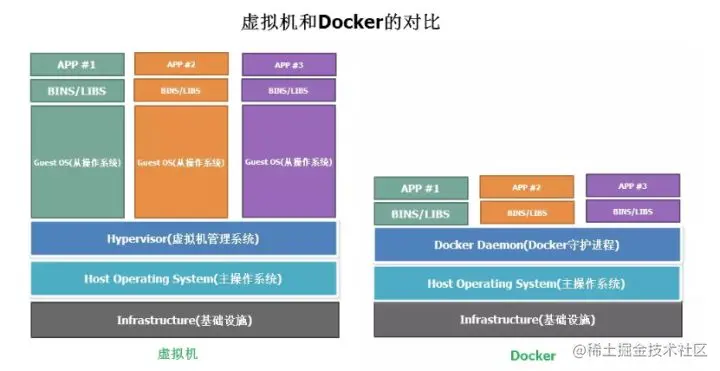 下面的图片比较了 Docker 和传统虚拟化方式的不同之处,可见容器是在操作系统层面上实现虚拟化,直接复用本地主机的操作系统, 而虚拟机传统方式则是在硬件层面实现。