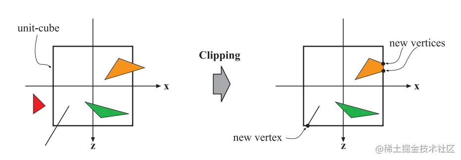 在组装完图元以后,会针对图元做裁剪和背面剔出操作,从而减少发送到下一个阶段的图元个数。当时图元不在视锥范围(我们也叫它裁剪空间,每个顶点坐标的空间范围是附值给gl_Position的第四个值w,所以本例子中的裁剪范围为-1.0到1.0的范围)内的时候,会对其进行裁剪,如下图,红色三角直接被删除,黄色三角被裁剪掉一部分,并重新创建了两个新的定点。