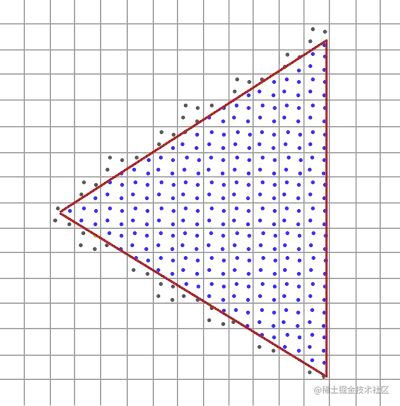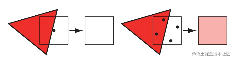 以下图第二个图为例,我们发现三角形覆盖了4个采样点中的两个,所以最终片段得到的颜色值需要乘以采样点覆盖率0.5,得到的是浅红色的颜色
