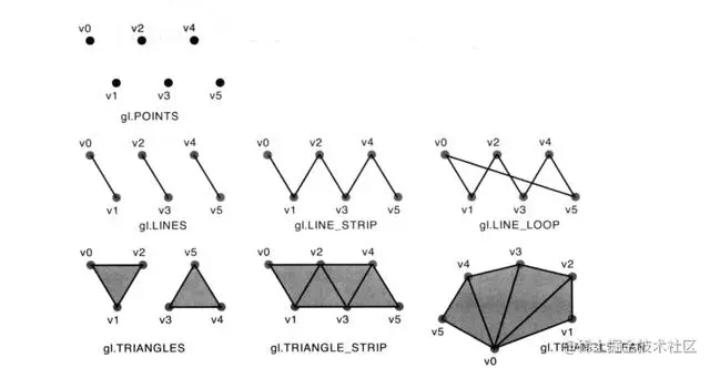 图元组装是将顶点着色器中输出的顶点组装成指定的图元,在webGL中常见的图元主要包括以下7种类型: