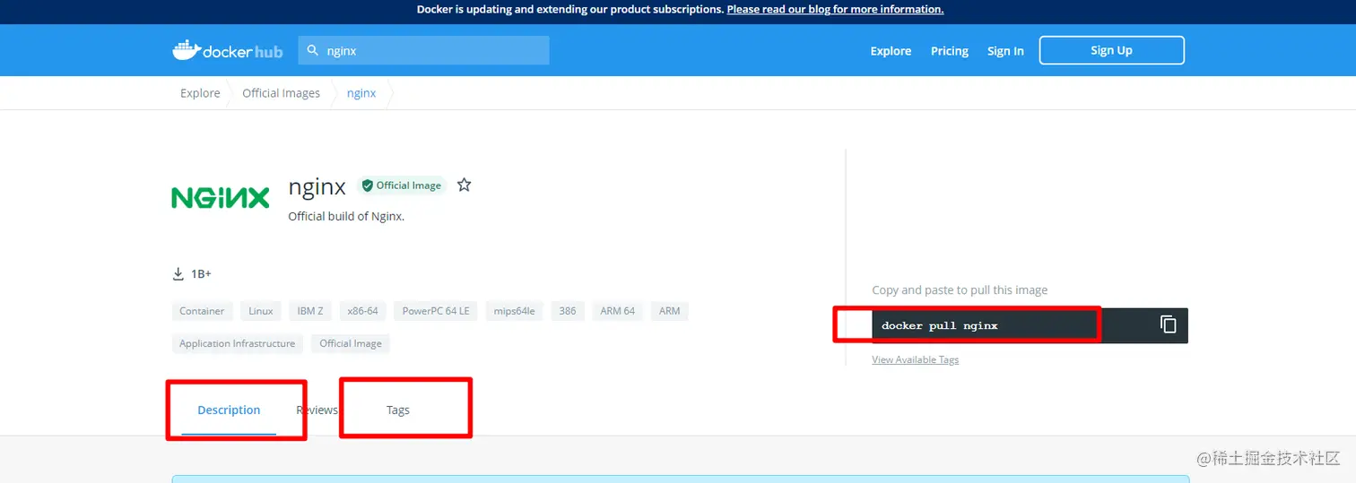 找到镜像后,有对应镜像的版本和拉取/启动命令
