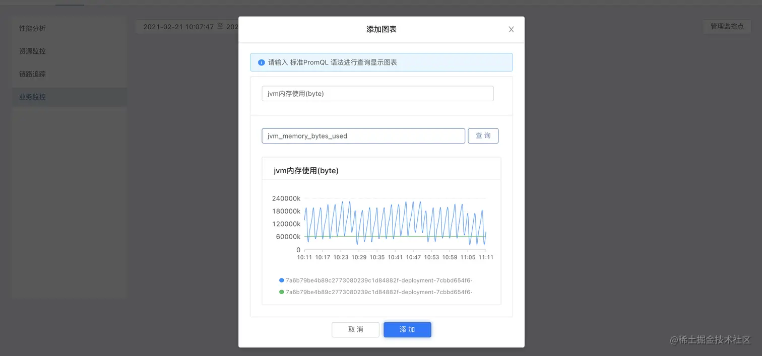 接下来就可以添加一个监控图表,来展示 JAVA 服务组件中 JVM 的指标行: