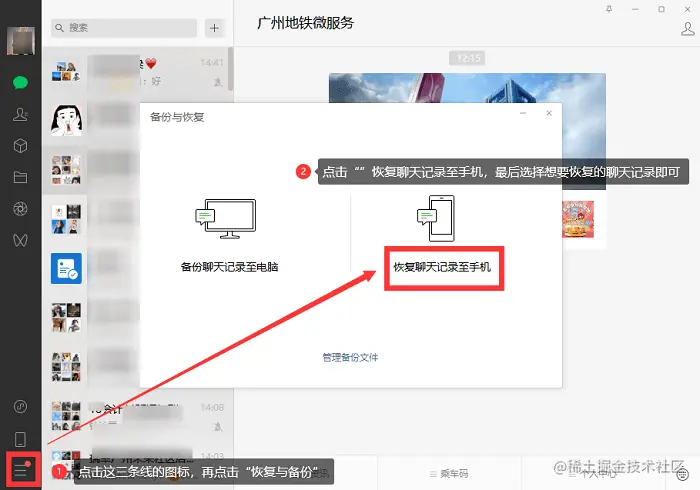 首先,在电脑上登录微信,然后点击左下角的三条线的图标,在点击“恢复与备份”,最后点击“恢复聊天记录至手机”,选择需要恢复的聊天记录就好啦!
