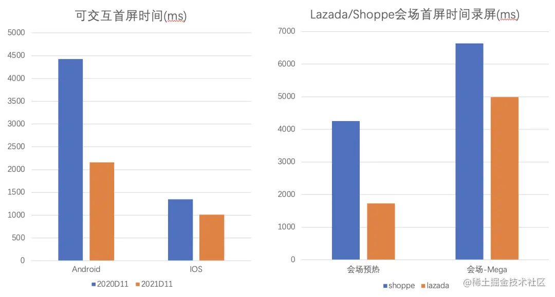 经过一年时间的深度优化,在Android平台,2021 D11会场首屏时间比2020 D11提升50%,IOS首屏时间进入秒开时代;印尼机房真机录屏数据显示,预热场景下主会场首屏时间比竞品Shopee快1倍,非预热场景会场也比竞品Shopee快24.8%。