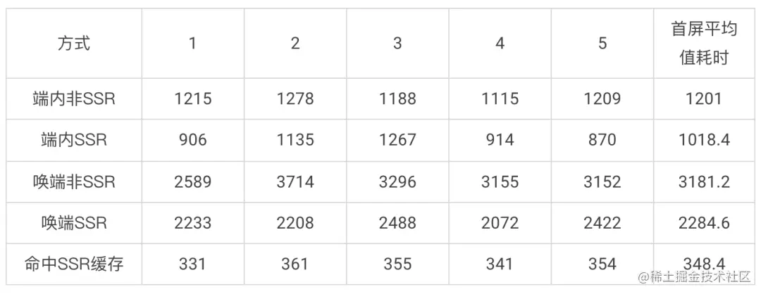 在相同环境下(同手机、同页面、同App、同网络环境)进行测试,发现端内打开页面场景使用SSR能够优化15.2%的首屏时间,唤端场景使用SSR能够优化28.1%的首屏时间。具体测试数据如下: