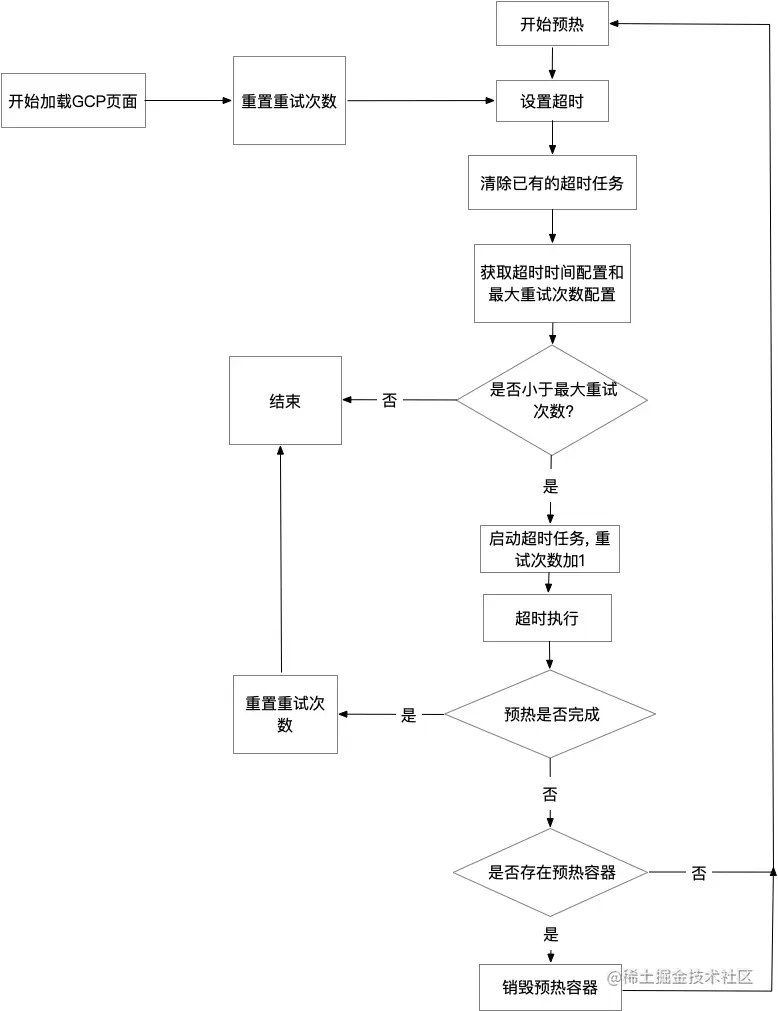 针对上述情况,我们提出了预热重试机制来提升预热的命中率。主要是两种预热重试的场景, 第一种是首页闲时预热重试; 第二种是打开页面后预热重试,定义超时时间,默认为10s,超时时间到了之后会检查是否完成预热,没有完成预热则会触发一次新的预热,最多重试次数为3次。具体流程如下图: