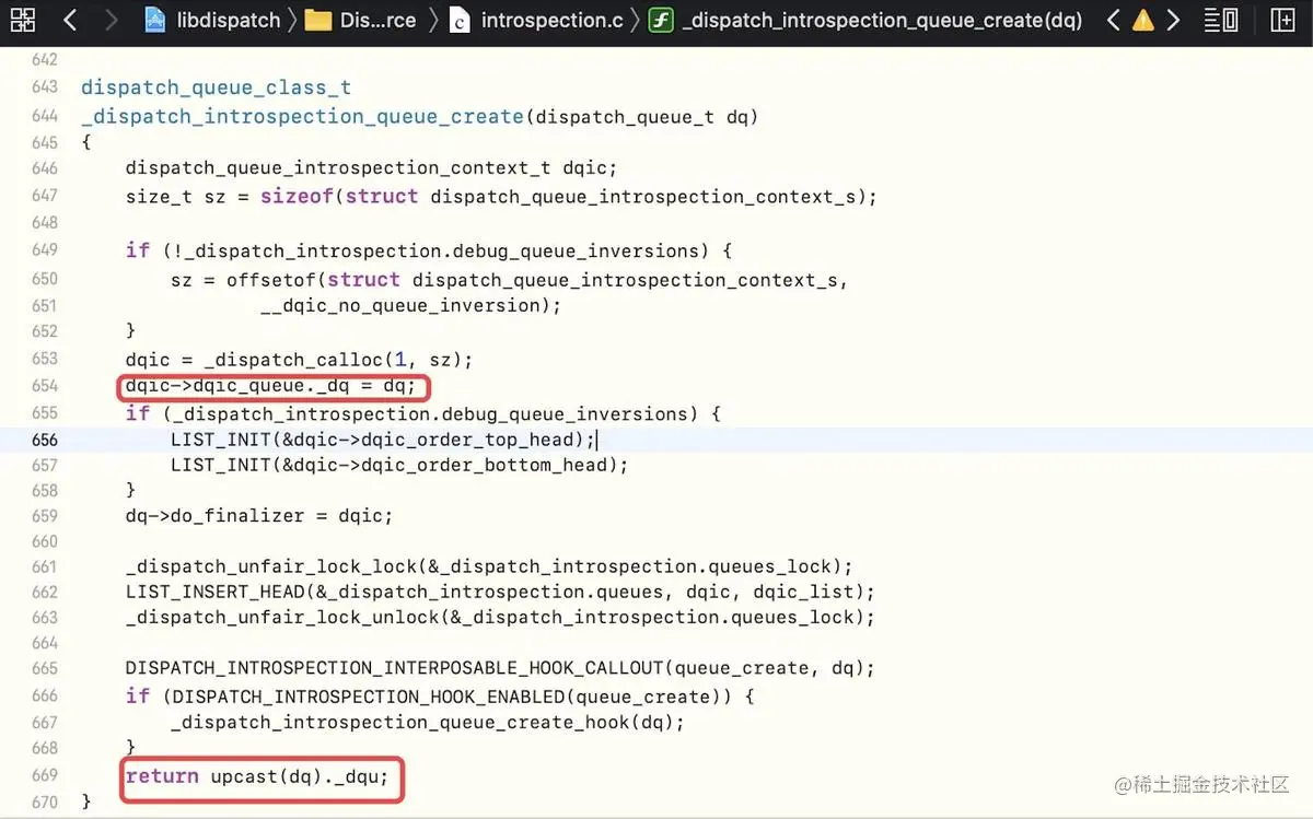 _dispatch_trace_queue_create对创建的队列进行处理,其中_dispatch_trace_queue_create是_dispatch_introspection_queue_create封装的宏定义,最后会返回处理过的_dq进入