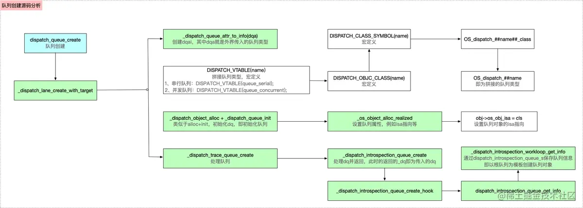 创建队列在底层的处理是通过模板创建的,其类型是dispatch_introspection_queue_s结构体dispatch_queue_create底层分析流程如下图所示