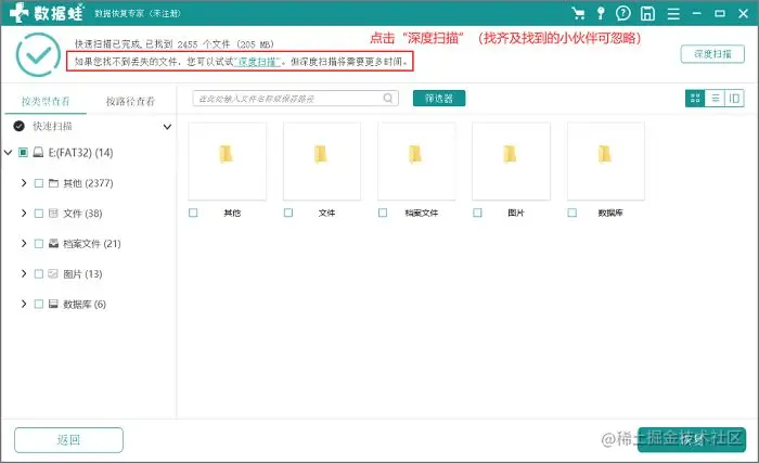 特殊操作: 找到所需文件及找齐文件的体验者可忽略该步骤,由于第一次扫描比较侧重于扫描速度,所以扫描范围和力度无法保证能找到所有丢失文件,好在我们还有“深度扫描”,马上点击它!