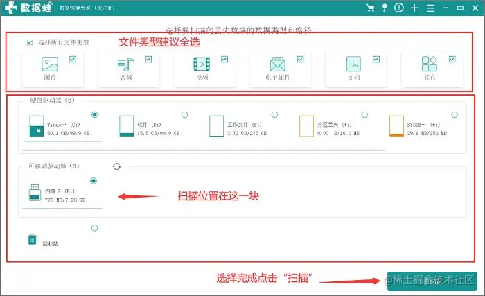 第2步:这里有各种文件类型及各个文件路径,文件类型即便丢失的仅有视频一种,也还是建议全选哦!亲自测试过全选后扫描结果较为全面;文件路径即是可移动设备这里(内存卡需通过读卡器成功连接电脑后才会显示)。选择完成就可以点击“扫描”啦!