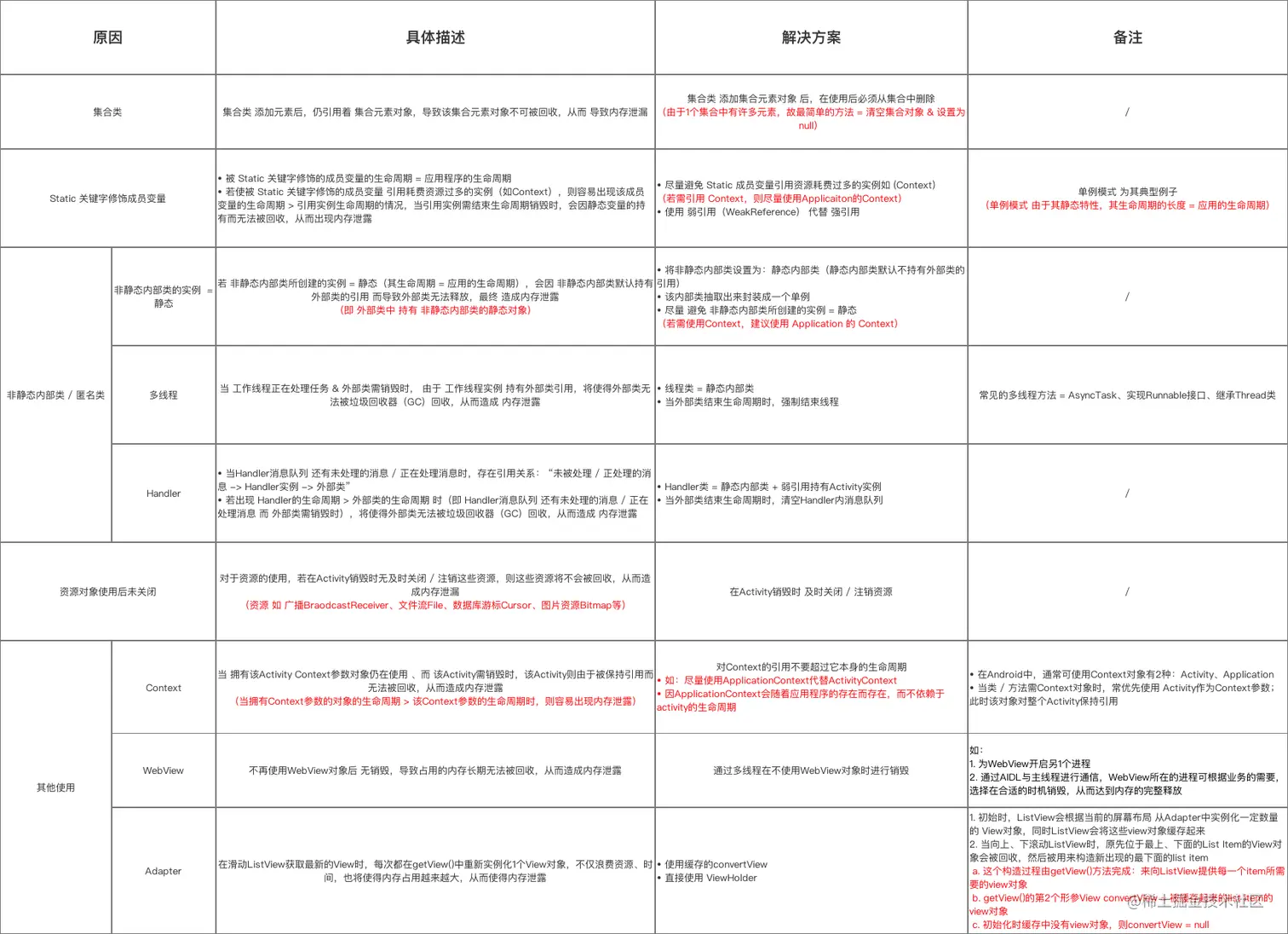 下面,我将用一张图总结Android中内存泄露的原因 & 解决方案