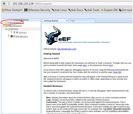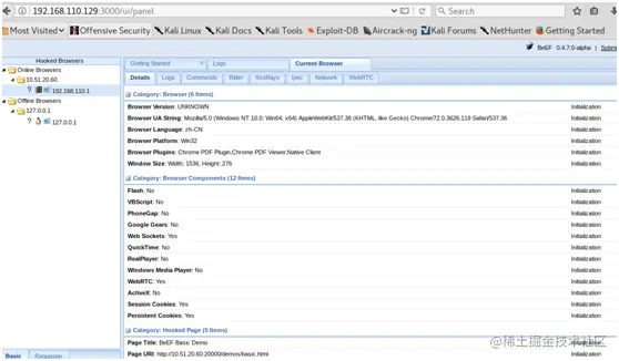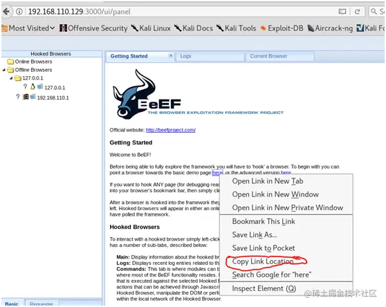 后来把host改成了kali的ip,js连接上了,但是beef的管理页面,也就是127.0.0.1:3000/ui/panel却无法打开了,试了下192.168.110.129:3000/ui/authentication倒是成功了,但是这其中的原因我还没明白