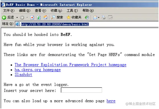 受害者Win2003输入的地址应该是端口映射后的地址:10.51.20.60:20000/demos/basic.html