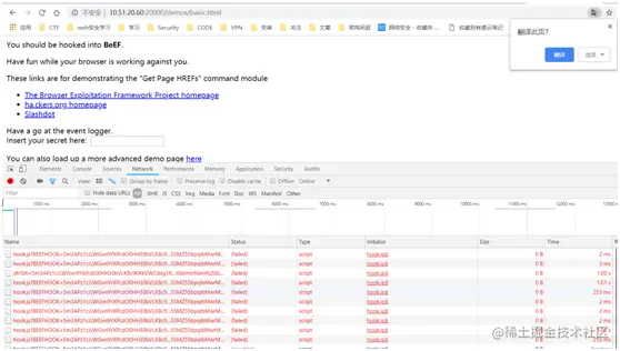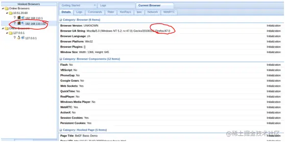 换成主机A尝试成功后,我又转回来研究2003失败的原因,因为只有ie,而且是旧版本的,没办法F12看具体的请求状况,我下了个47版本的火狐装上后,再次尝试访问demo,这次beef成功收到信息了,也就是2003被成功hook住了(我又摸不着头脑了???)