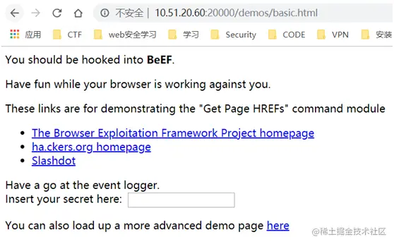 这就是beef的界面,复制basic demo link:http://192.168.110.129:3000/demos/basic.html