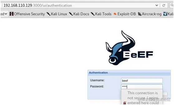 Beef弹出浏览器打开beef的后台管理,这里注意,原本应该是打开上图中的地址,但出了点问题(最后总结会说),所以我们要把ip改成kali的ip,也就是192.168.110.129:3000/ui/authentication