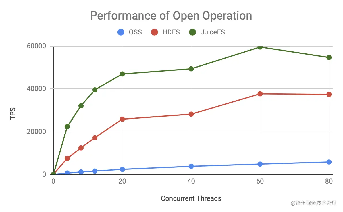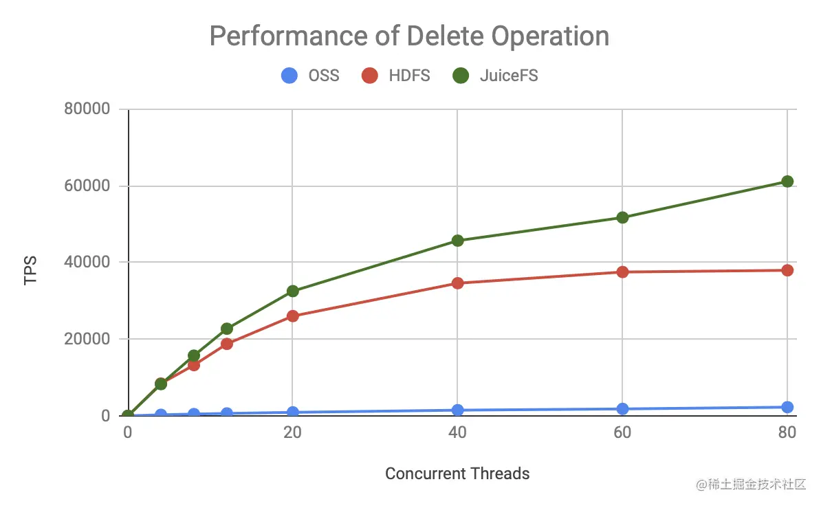 可见无论是哪种元数据操作,JuiceFS 的 TPS 增长更快,上限也更高,明显优于 HDFS 和 OSS。