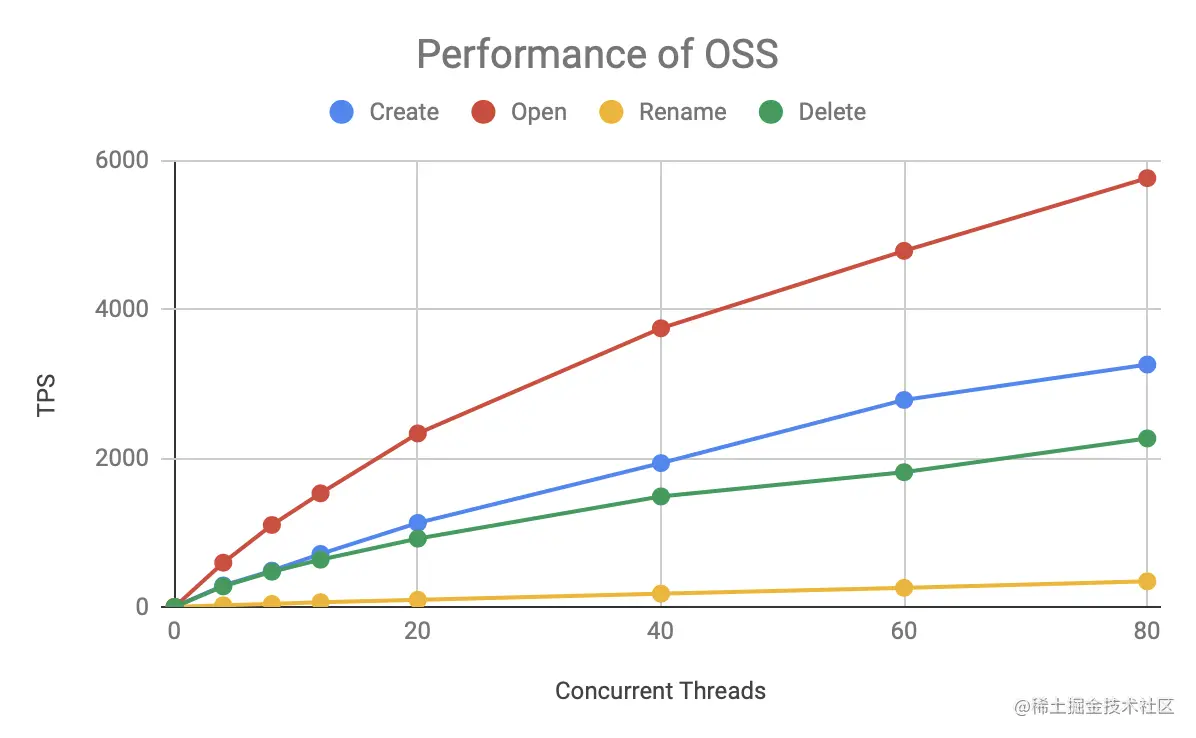 OSS 速度比 HDFS 慢了一个数量级,但它的各种操作的速度基本保持稳定,总的 TPS 随着并发数的增长而增长,在 80 个并发下还没遇到瓶颈。受测试资源所限,未能进一步加大压测知道它的上限。