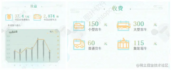 港珠澳大桥运维管理存在缺乏反馈机制和缺乏模式评估体系。运用 HT 可视化技术,可将大桥当日车流量等收益数据通过 2D 面板展示,从而建立起内部和外部双层反馈机制。管理人员只需点击点击左侧“收益”按钮,即可快速查看大湾区运营业务总效益反馈,总投资、当日过桥车次、过桥费收入一屏全览。右侧面板通过折线图展示经济带动趋势,方便运营人员进行评估;车流量与总收入对比展示,帮助运营人员掌握业务趋势,提高运营效率。