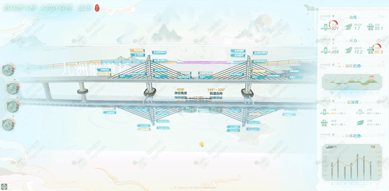 Hightopo 通过可视化技术,整合数据资源,实现大湾区数据共享,共同合作,互惠互利,形成合作紧密、共创共享的数据应用中心。通过可视化手段,涵盖大桥建设细节与营运过程管理业务,以运营管理为主线,通过效益、大桥基本信息等数据关联的综合控制和管理,从而实现了多业务、多流程、多信息的集成管理。