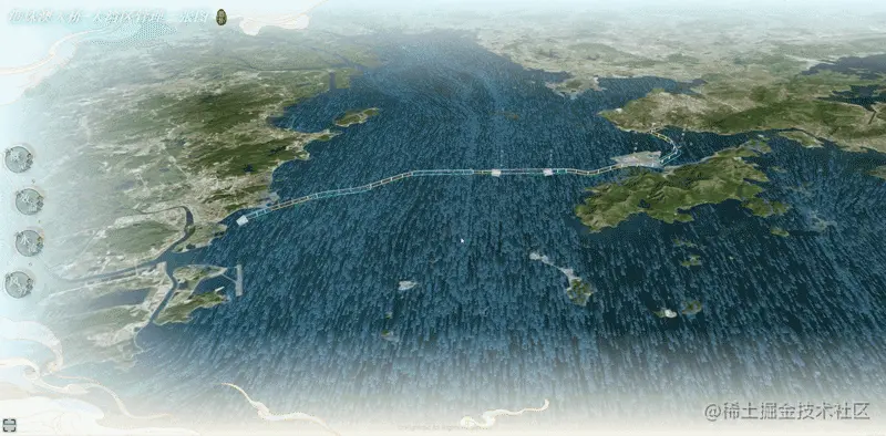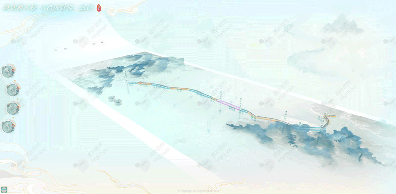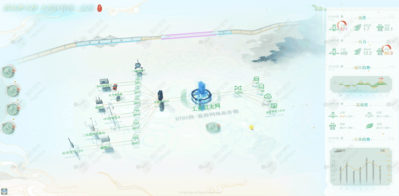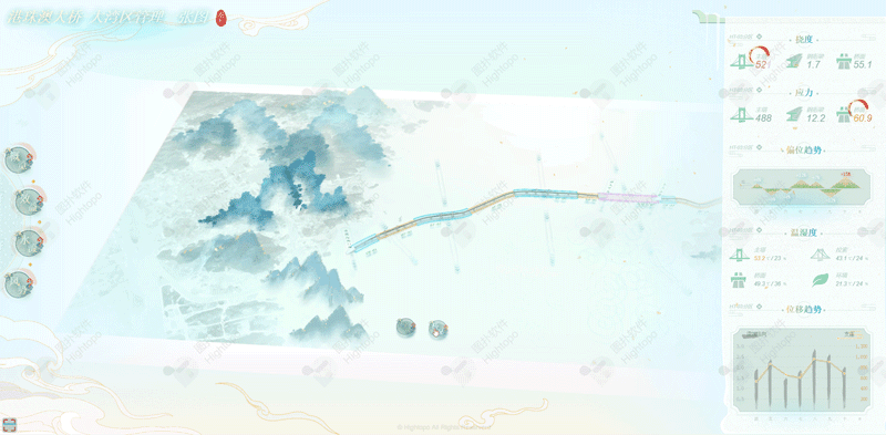 Hightopo 采用自主研发的 HT 产品,搭建起一套水墨风的 3D 港珠澳大桥-大湾区管理可视化系统。通过三维建模,结合 HT 丰富的 2D、3D 组态,多角度直观展现大桥结构、效益、地理环境等重点管理对象的运行态势,并围绕经济效益、施工结构等业务,提供了完善的监测管理方案。