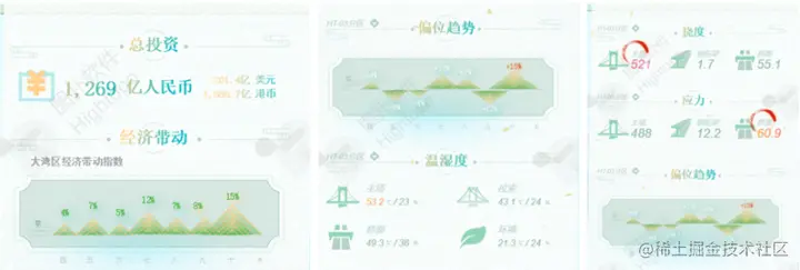 港珠澳大桥从立项到建成通车历时十数年,在当前粤港澳大湾区建设的新形势下,大桥开通后面临粤港澳三地深度合作的新契机。Hightopo 通过图表、平面图、三维图形等对港珠澳大桥全面展示,全面系统地聚合展现刷新大湾区发展数据资源,并进行分析对比呈现,帮助决策者通过一个显示屏幕全面掌握大湾区的发展情况。