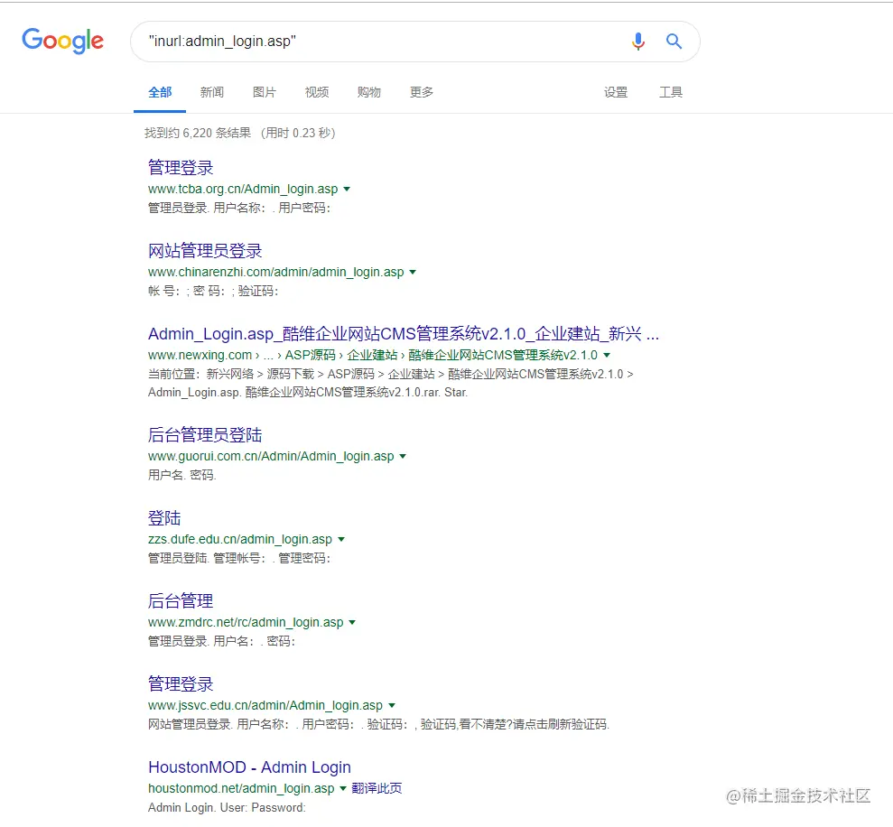 技巧2: "inurl:admin_login.asp" 查找后台登录页面