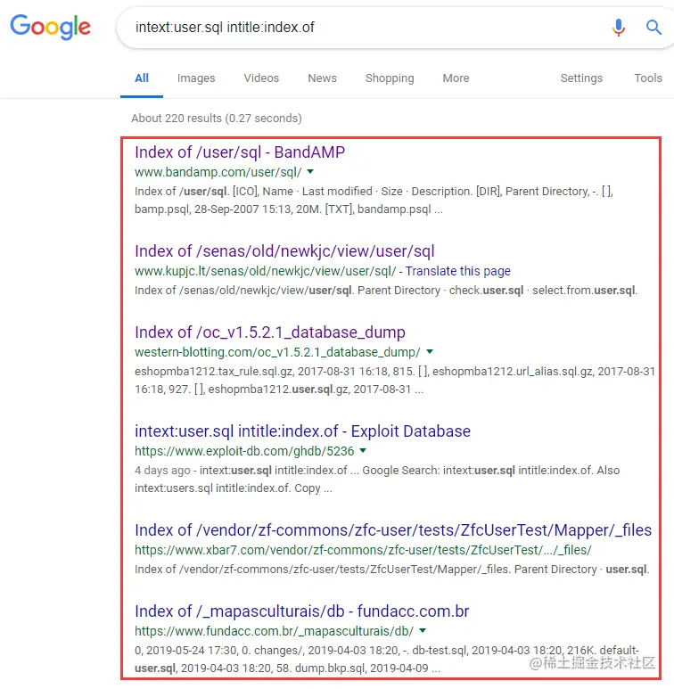 技巧 7 “intext:user.sql intitle:index.of” 组合使用技巧