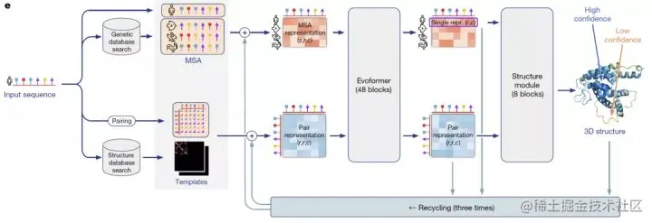 AlphaFold2通过独特的神经网络和训练过程设计,第一次端到端地学习蛋白质结构。整个算法框架通过协同学习蛋白质的多序列比对(MSA)和氨基酸对(pairwise)的表征,将蛋白质序列的进化信息、蛋白质结构的物理和几何约束信息结合到深度学习网络中。我们将从数据预处理、Evoformer和Structure Module三个模块分析AlphaFold2算法的设计思想。